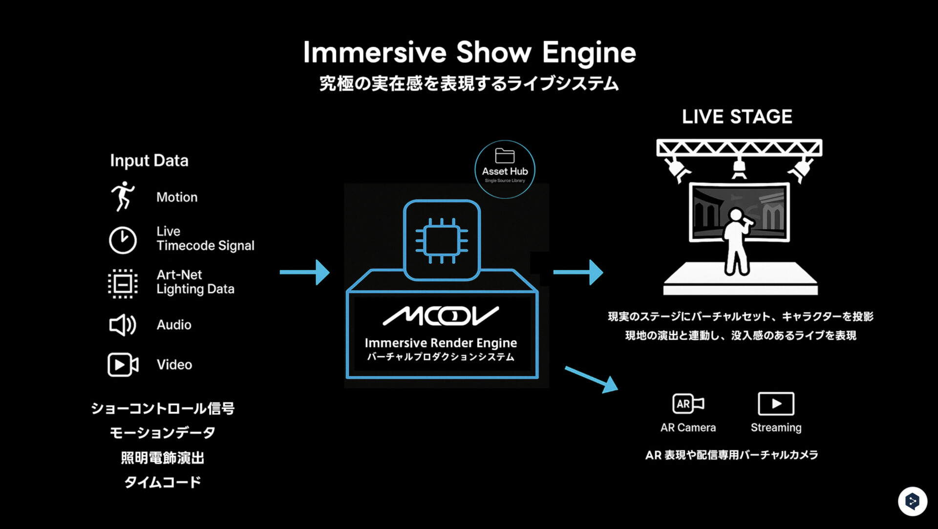 「MOOV Immersive Show Engine」は現実と仮想空間をつなぐためのシステムです。ライブエンタメに特化しており、必要な制御信号を受け取り、それをレンダリングするためのパッケージです。ブースに出展されているものは簡易的なものになりますが、小型のライブハウスから、ドームレベルのライブ会場、配信バーチャルライブまで、幅広い実績を持っています。